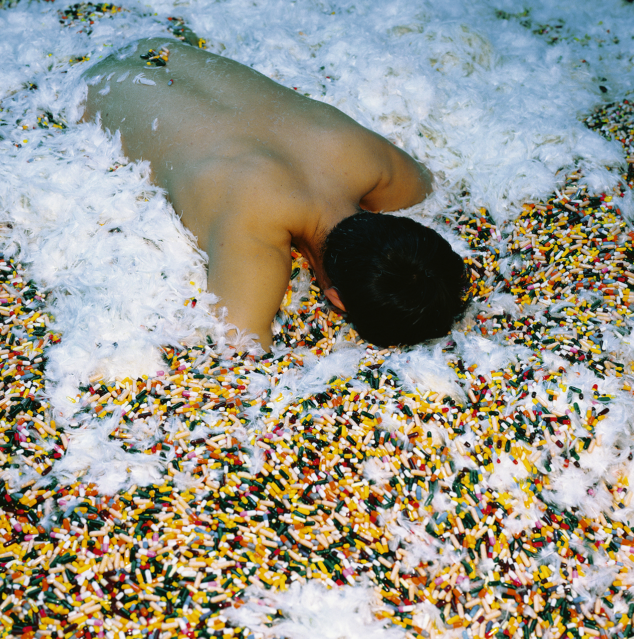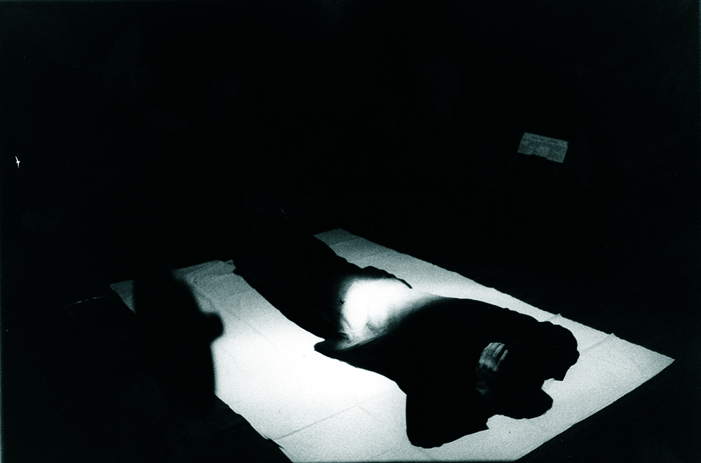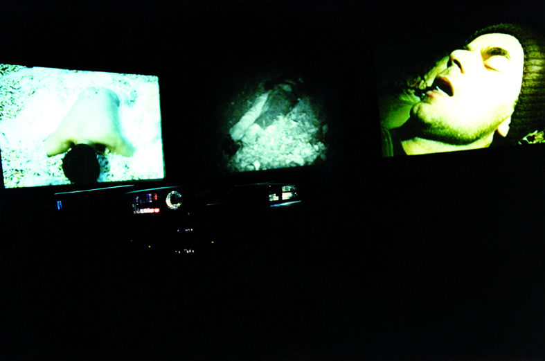 The audience in the hall was viewing a triple video projection. Two projections showed the video recordings of the artist rambling through the woods and raving among detritus and waste in his cellar, which were filmed previously. The third projection was the real-time broadcast of the artist’s performance in the next room in which he lay down, headfirst and motionless in a heap of pills and feathers.